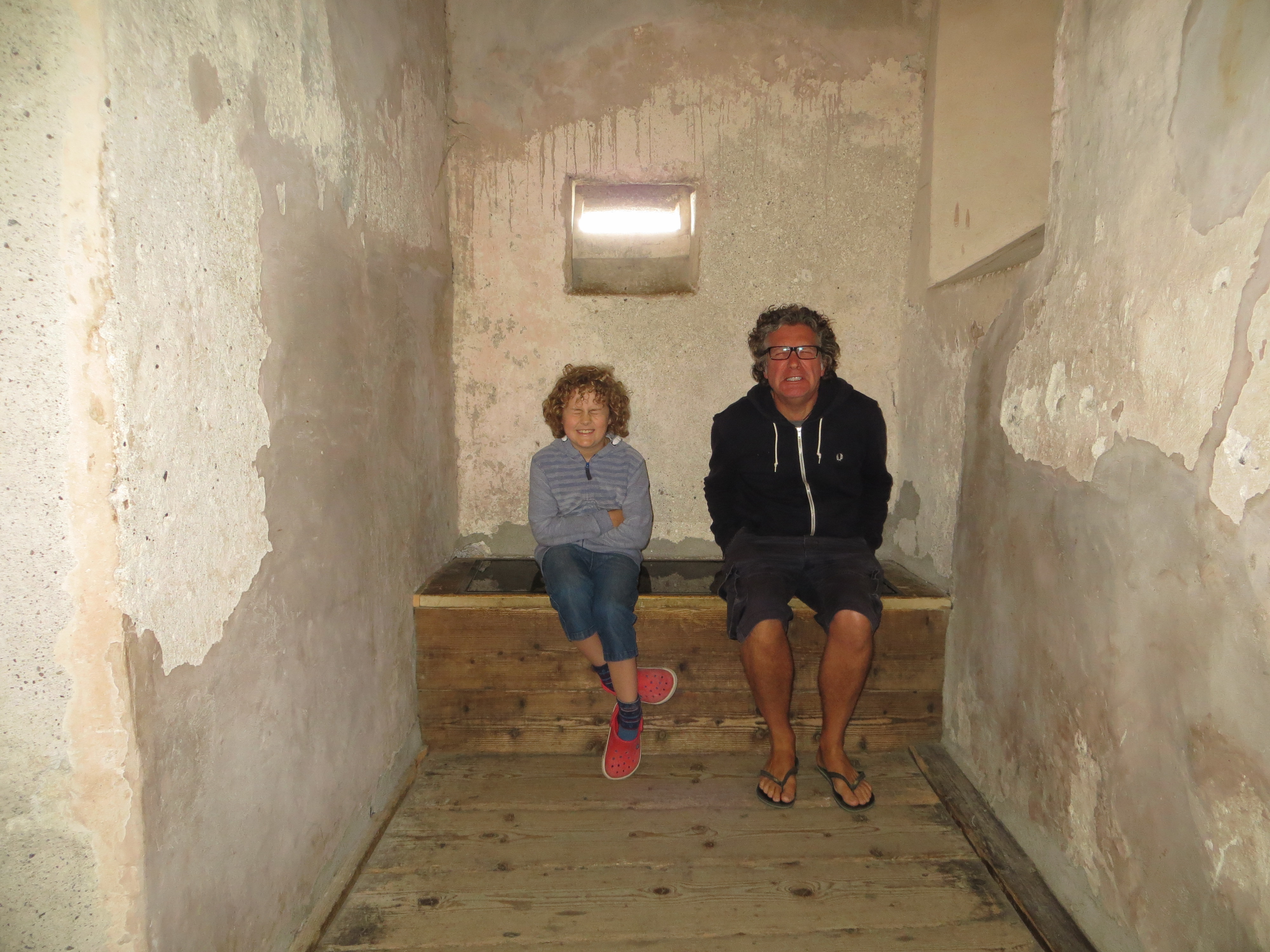 The next day we left France (we were camped on the French side of the lake), stopping just over the Swiss border for a mooch around Chateau de Chillon. This castle, built on the rocky edge of the lake, has its earliest historical note in 1005, and is really a series of numerous buildings connected together over the years. Its real claim to fame is as a prison (both ancient and recent), with some rather sad stories of misery – including the political prisoner Francois de Bonivard imprisoned in 1530 and written about by Byron in ‘The Prisoner of Chillon’. Despite this, the castle has wonderful areas to explore, including the keep where you can wind your way up the steep stairs to safety from the invading husband and son. Will found the open latrines and amusing old toilet related anecdotes and pictures especially amusing. Boys!