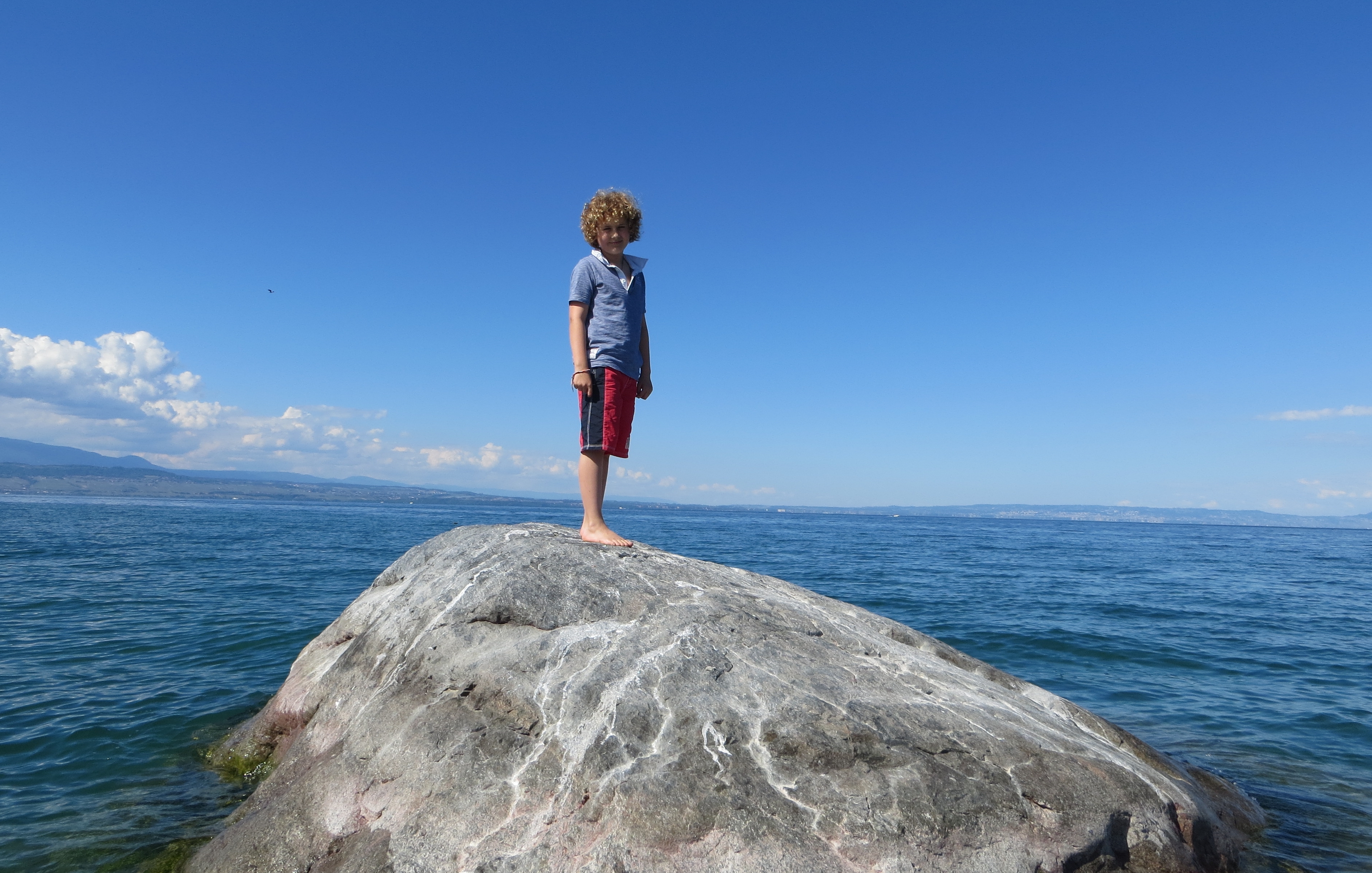 Heading off promptly the next morning, we arrived at Lake Geneva early in the afternoon on a sunny Sunday. A lakeside pitch was secured and we headed on to the beach to join hoards of locals enjoying the early summer sunshine. Hiring a pedelo, we tried to jettison William – abandoning him on a rock in the lake but despite our quick pedalling, he managed to hitch a ride back to shore by holding onto the back of the pedelo. Note to self – get a motor boat next time you need a quick getaway J.