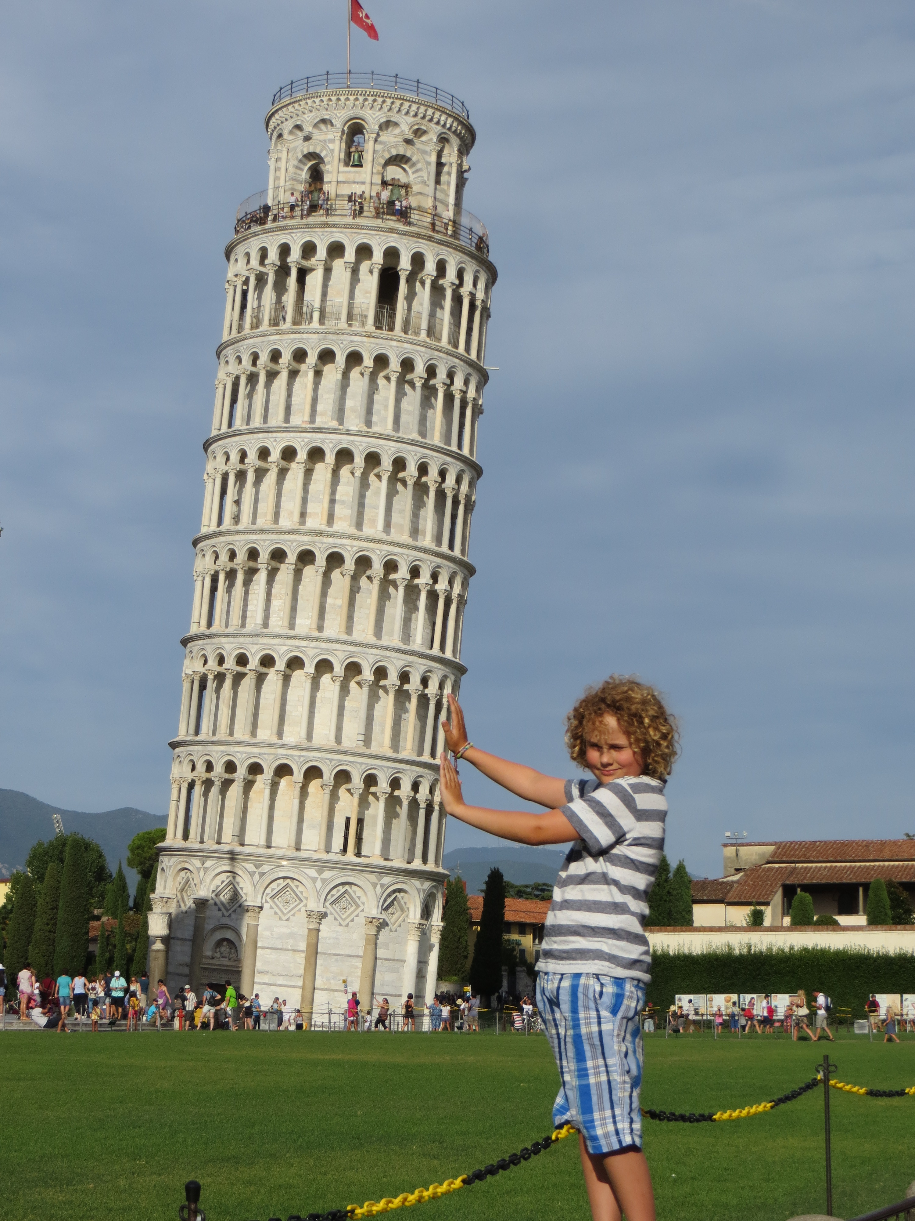 As if we haven’t had enough of pizza, William had requested that we return to Pisa for pizza (almost works). We were in Pisa a couple of years ago, but Will was too young to climb the tower and he really wanted to go back, so one of the wonderful things about this trip is that back we could go. Camping Mary, our magnetic virgin from Semana Santa who stuck to the front of our van and sought out campsites from Seville to Croatia, (where the storms finally beat her) may have left us, but she was still looking out for us in Pisa where we camped 500m from the tower.