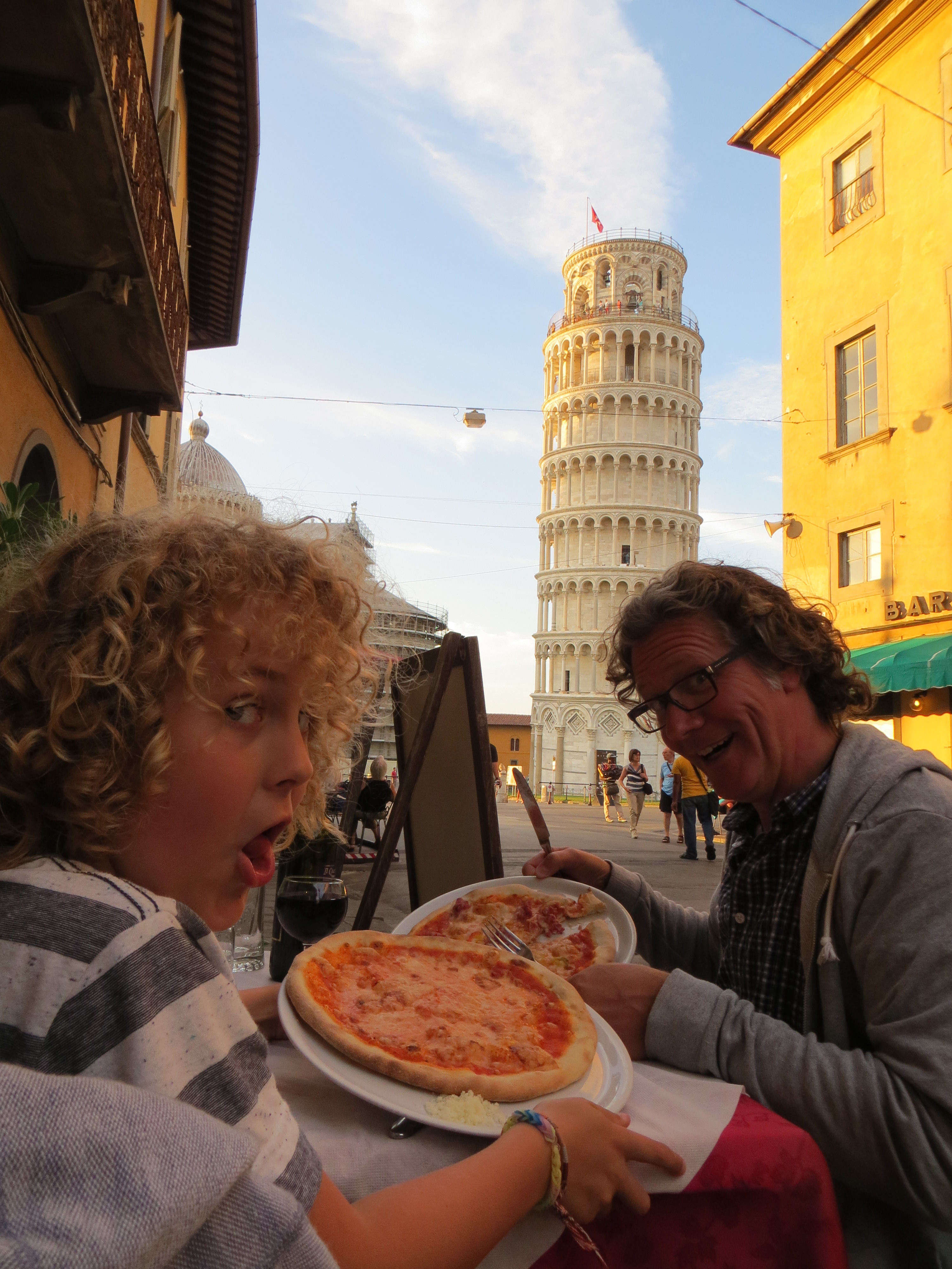 Our Traveling Willbury, who at the beginning of the trip tiptoed up stairs, took it all in his stride, hurrying us oldies along to get to the top. It’s a super spot up there – though we are not sure why. The view is OK, but not spectacular, the bells are lovely but not particularly special. We decided it’s simply the wonder of the building itself – a dainty ornate bell tower that just shouldn’t still be standing. We returned to earth, snip snapped our photos and then snagged a table overlooking the tower for our pizza by Pisa. Fabulous choice Will!