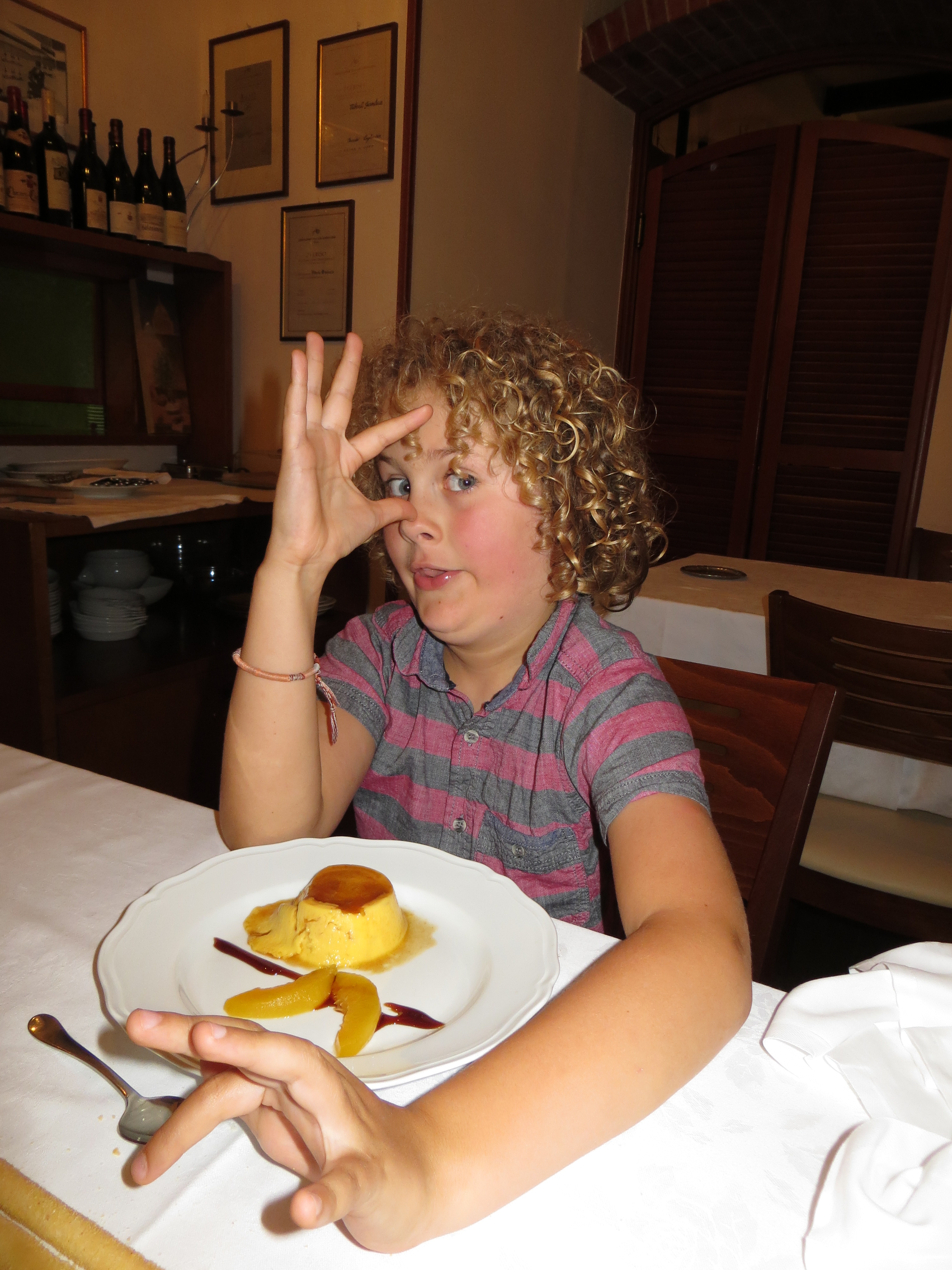 We had decided to celebrate our month in Italy with a slap up meal and some good wine. We headed into the region that provides Barolo, Barbera and Asti (the cheap wine of my early youth…), and is the home of ‘slow food’. Staying in a small village called Vergne, we attempted kite throwing again, with as much success as previously, before walking from our campsite, through the square and into one of the region’s best restaurants….(it was planned that way due to superior navigational skills of course….sort of). This was to be Will’s first ever four course meal (including stuffed zucchini flowers which really pushed the nine year old palette) and we enjoyed some superb Asti to kick off the meal (who knew it didn’t have to be sweet as sugar water), some Barolo to accompany the main, and a super dessert wine (name escapes me), of which I polished off both mine and half of Deane’s as he was elsewhere (any guesses where?). A super dinner, a super night for a super country……